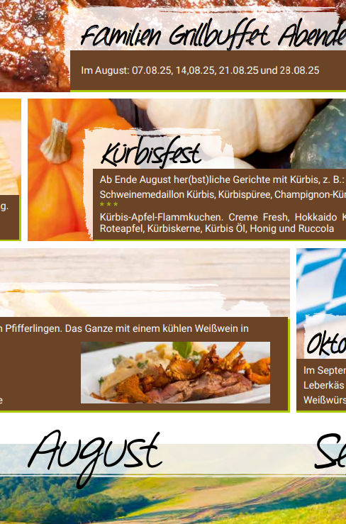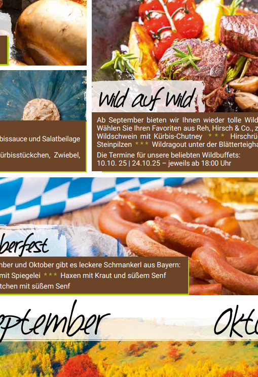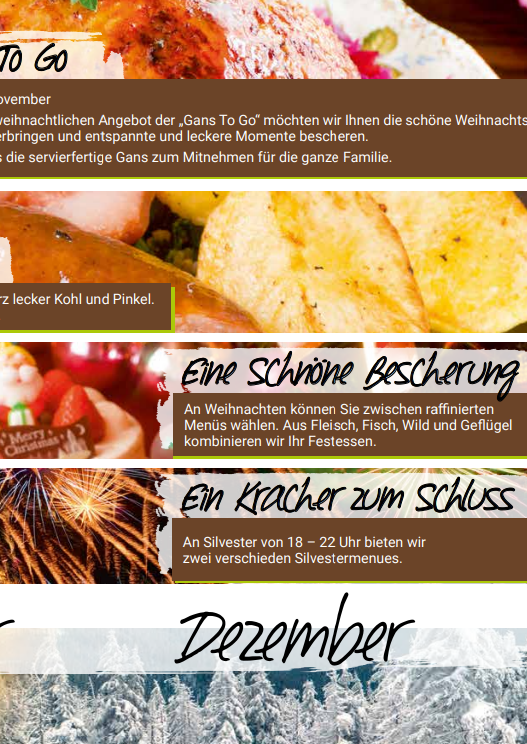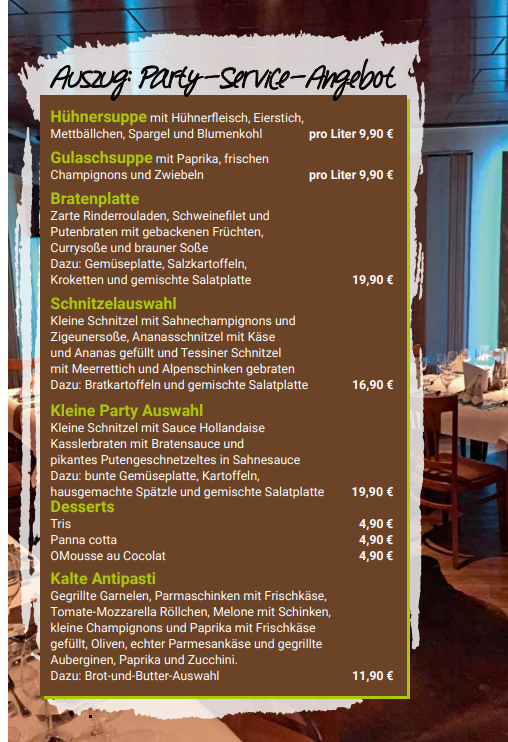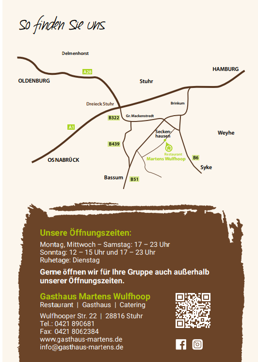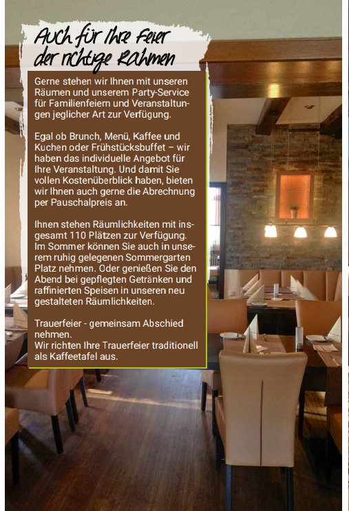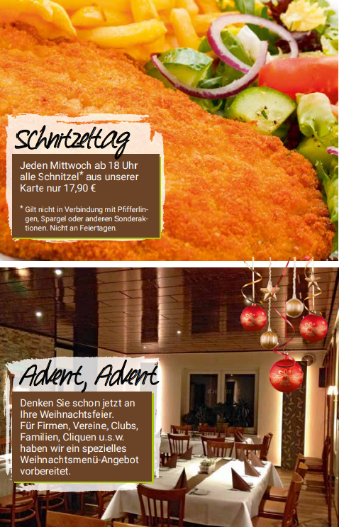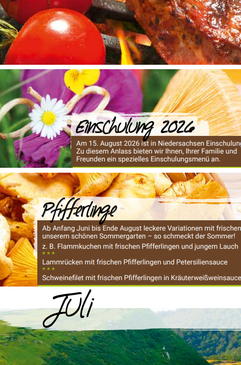 Genießen Sie eine vielfältige Auswahl an gutbürgerlicher, norddeutscher und mediterraner Küche in unserem gemütlichen Lokal. In den Sommermonaten öffnet unser Biergarten seine Türen, wo Sie bei einem guten Getränk und Blick ins Grüne entspannen können.Mit einem Klick auf den Button kommen Sie zu unserem neuesten Flyer